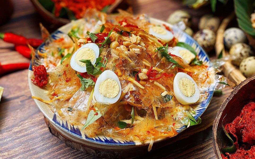 In District 1, near the Notre Dame Cathedral and Turtle Lake, Banh Trang Tron stands out as a popular choice. This Vietnamese rice paper salad is tossed with dried shrimp, quail eggs, peanuts, and fresh herbs, offering a delightful mix of flavors and textures. Another must-try is Banh Trang Nuong, often referred to as Vietnamese pizza, which features crispy rice paper topped with egg, dried shrimp, and green onions, grilled to perfection.